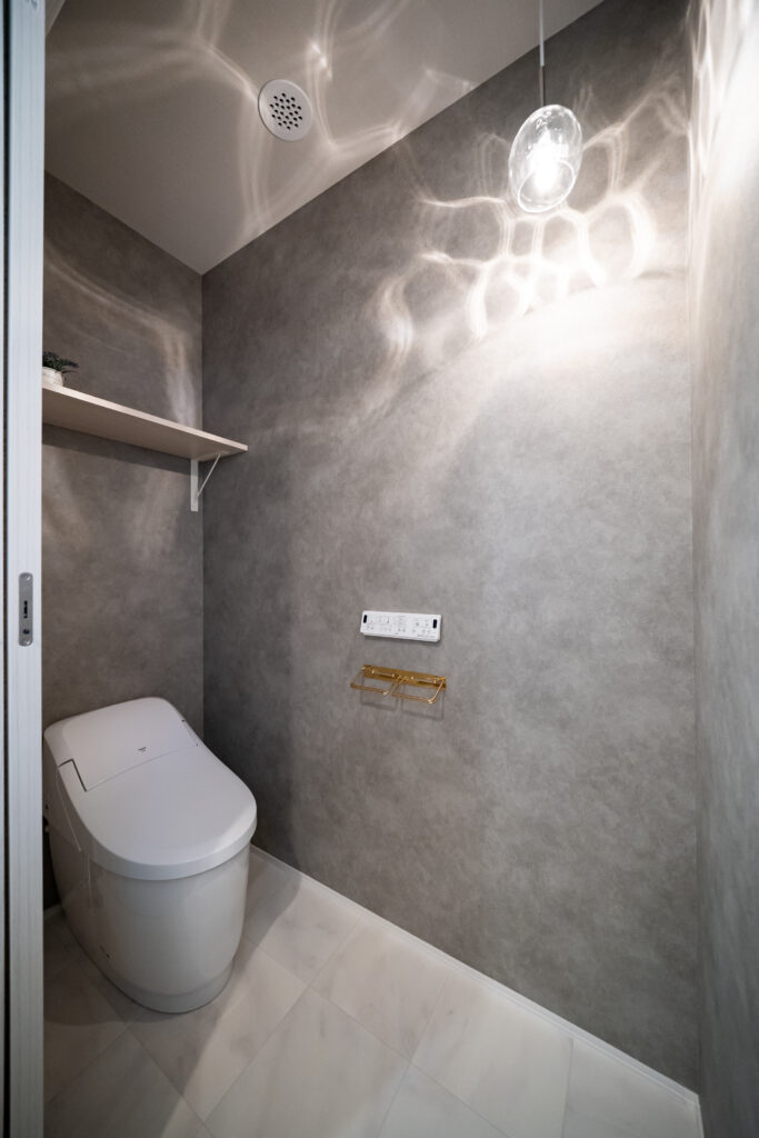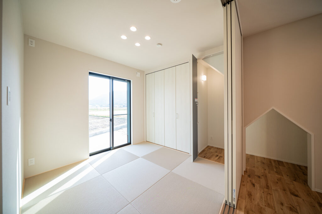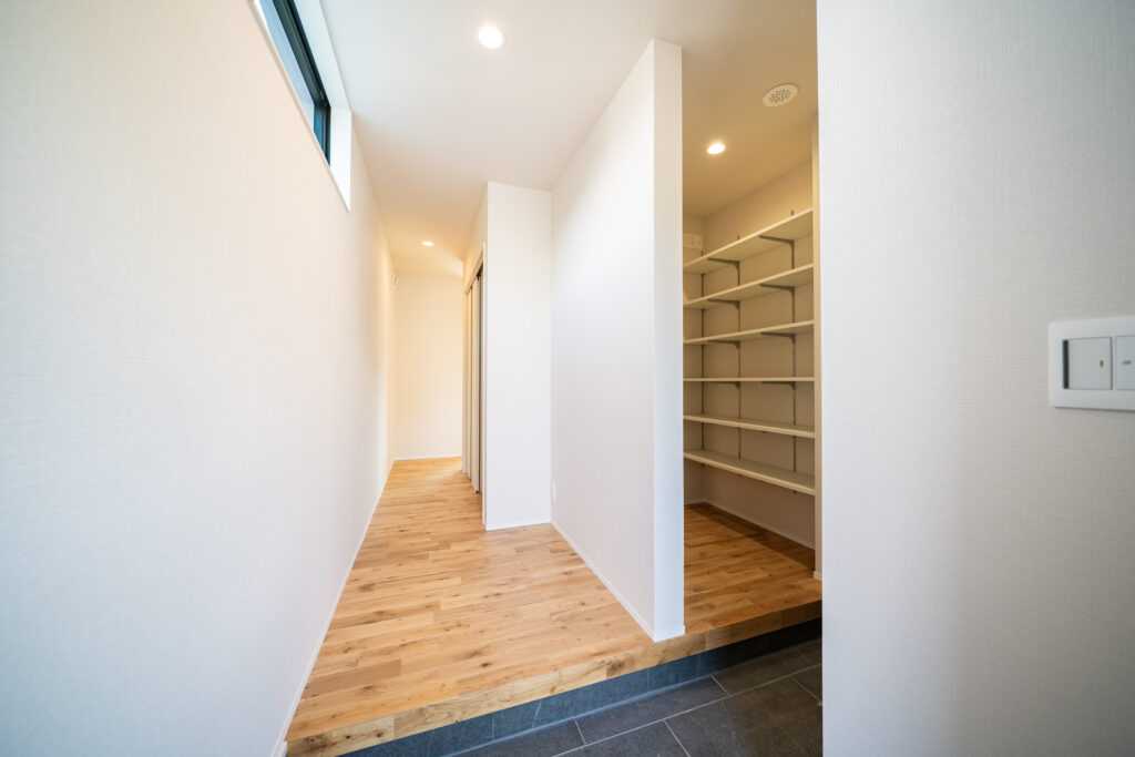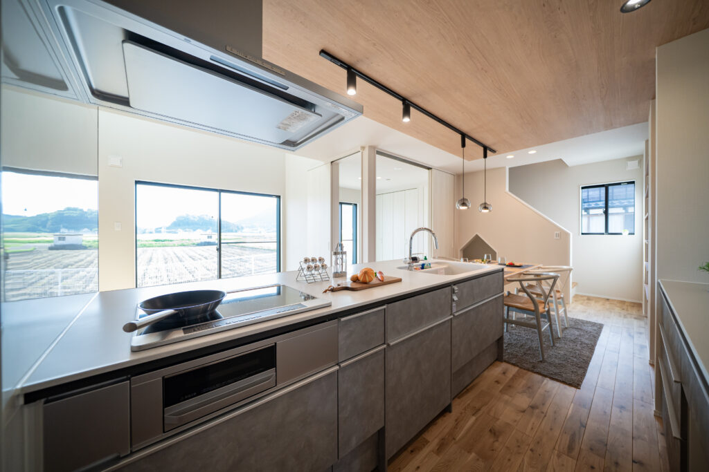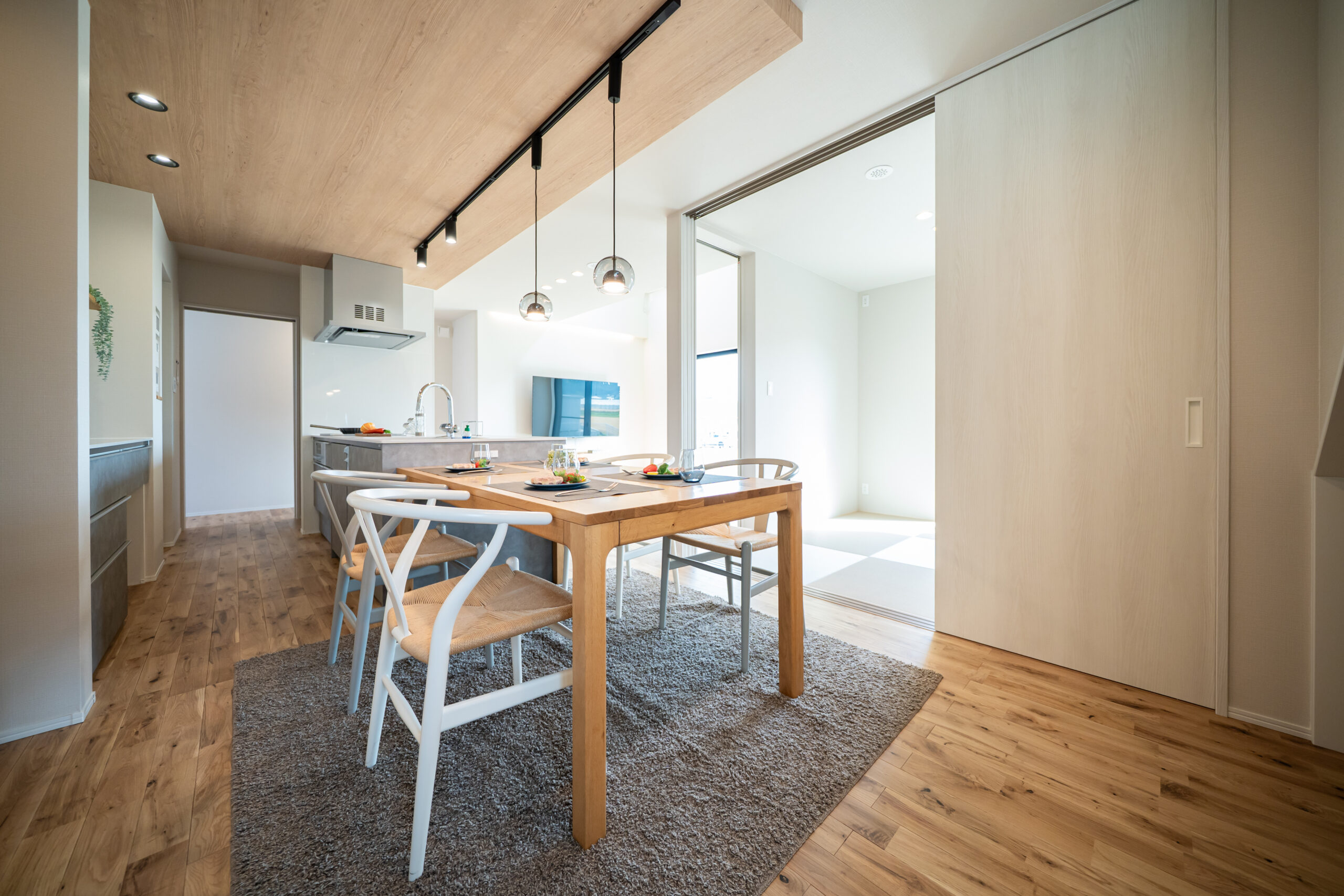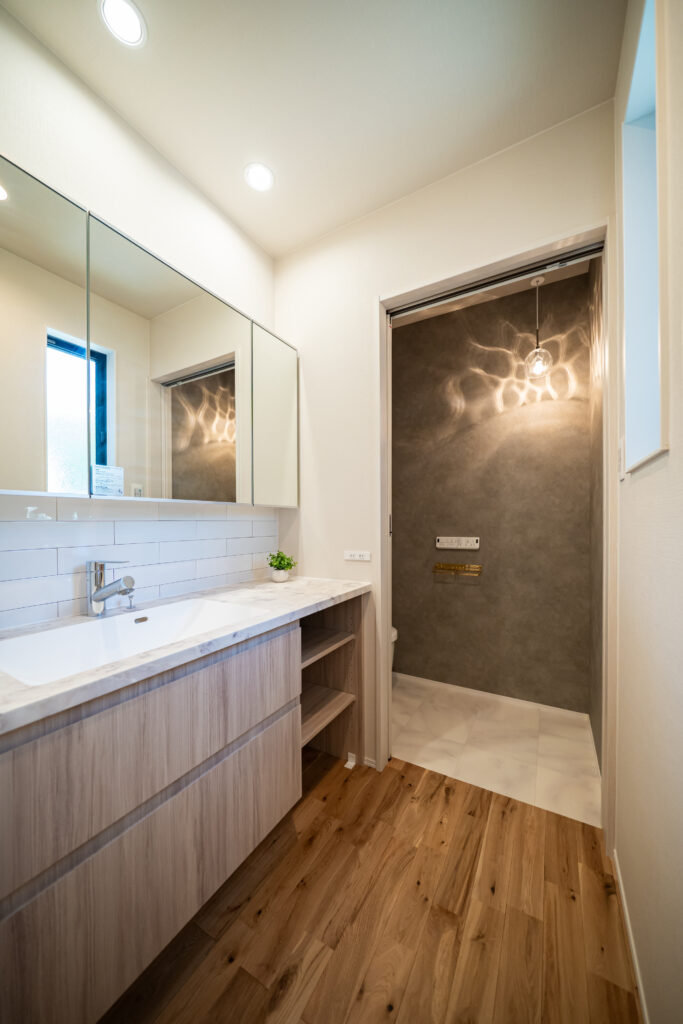 帰宅時に収納しながらキッチンへ行ける動線や配膳が楽な横並びダイニングキッチン。リビング・和室も見渡せるキッチンだから、お子さんの様子を見ながら家事ができて安心。もちろん、ランドリールームを兼ねた広めの脱衣室と洗面スペースは別空間にして、洗面はちょっとおしゃれに。間接照明や設備も充実した格好良い住宅です。