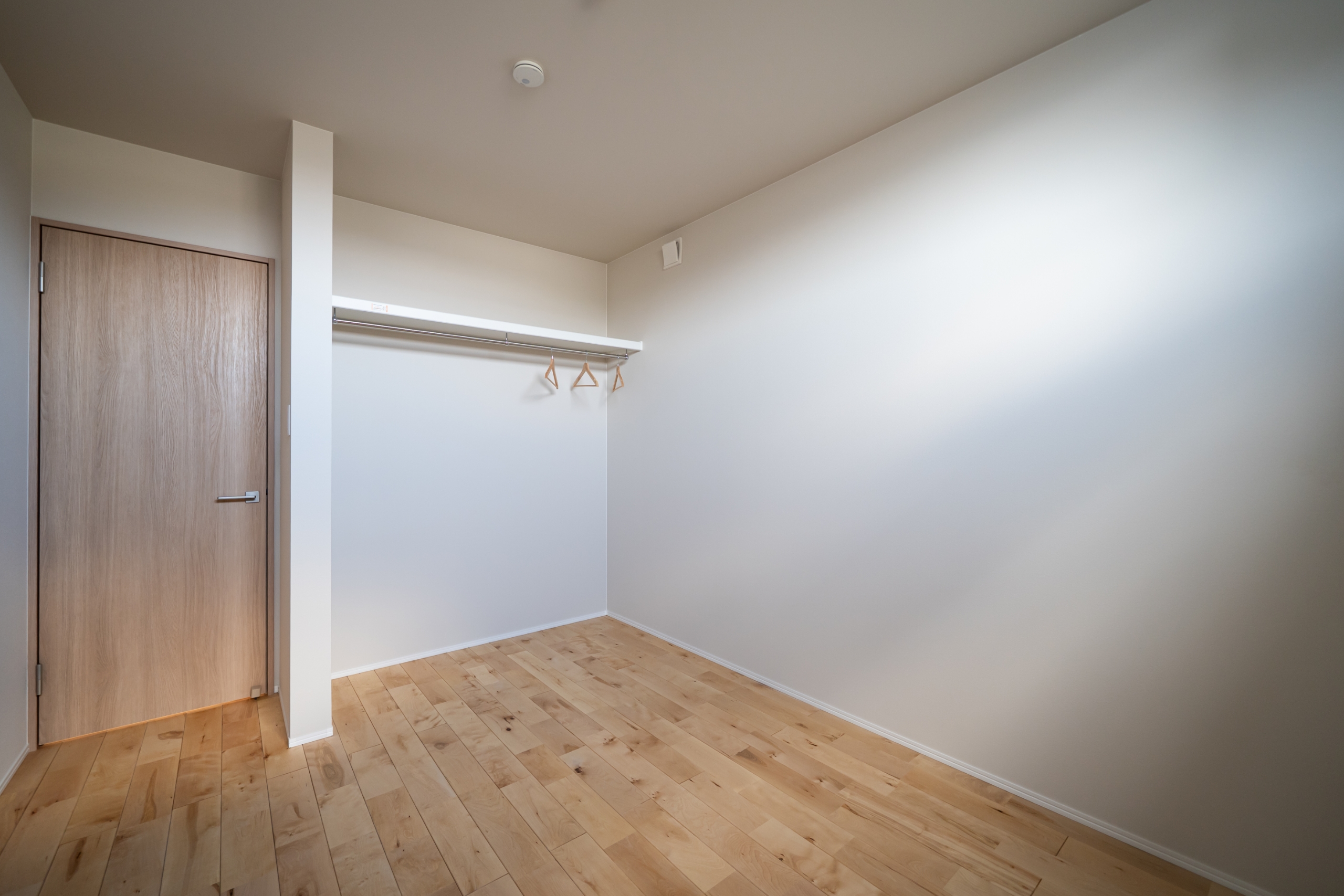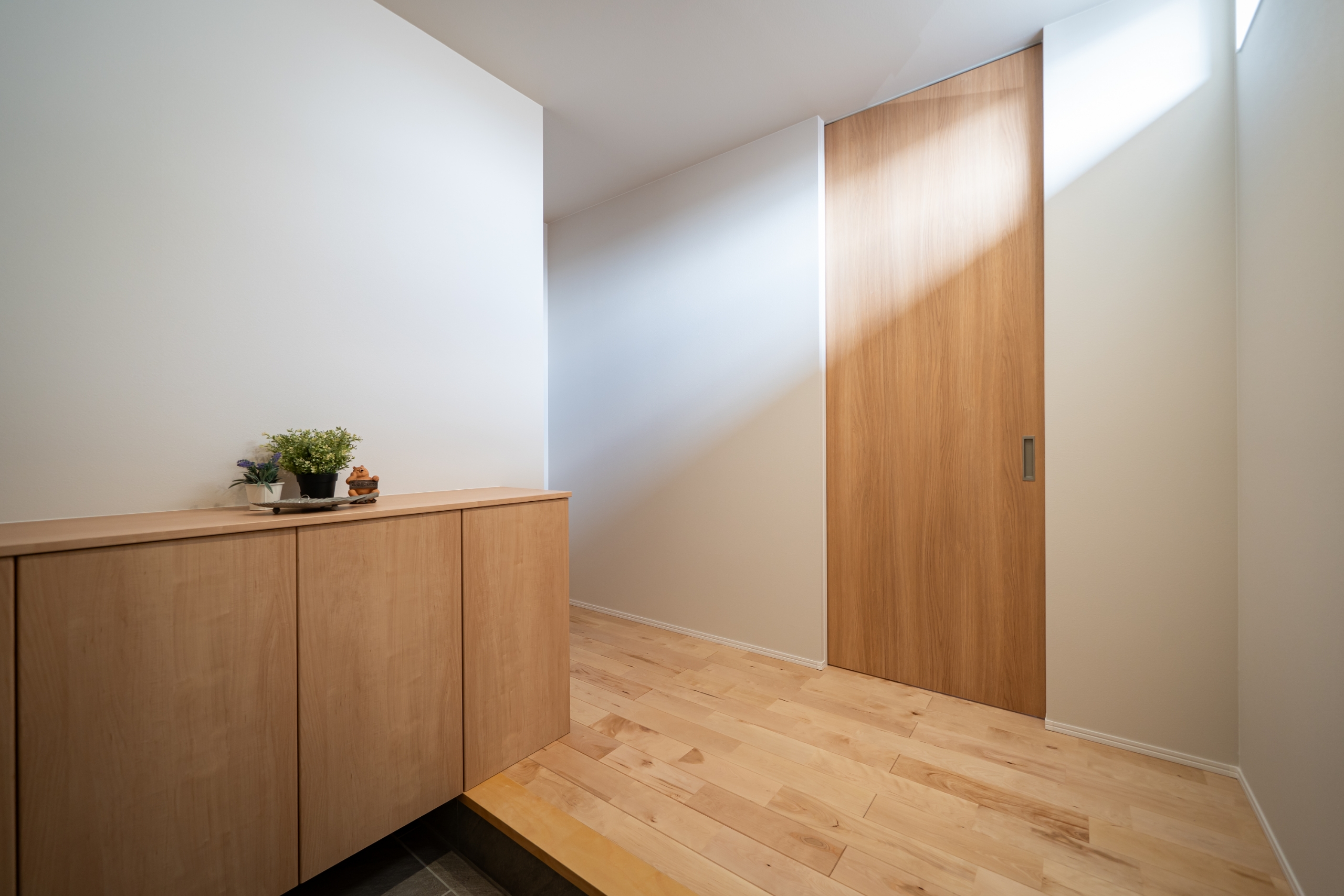 明るい木目と白い壁が調和した、やさしい雰囲気の玄関空間。