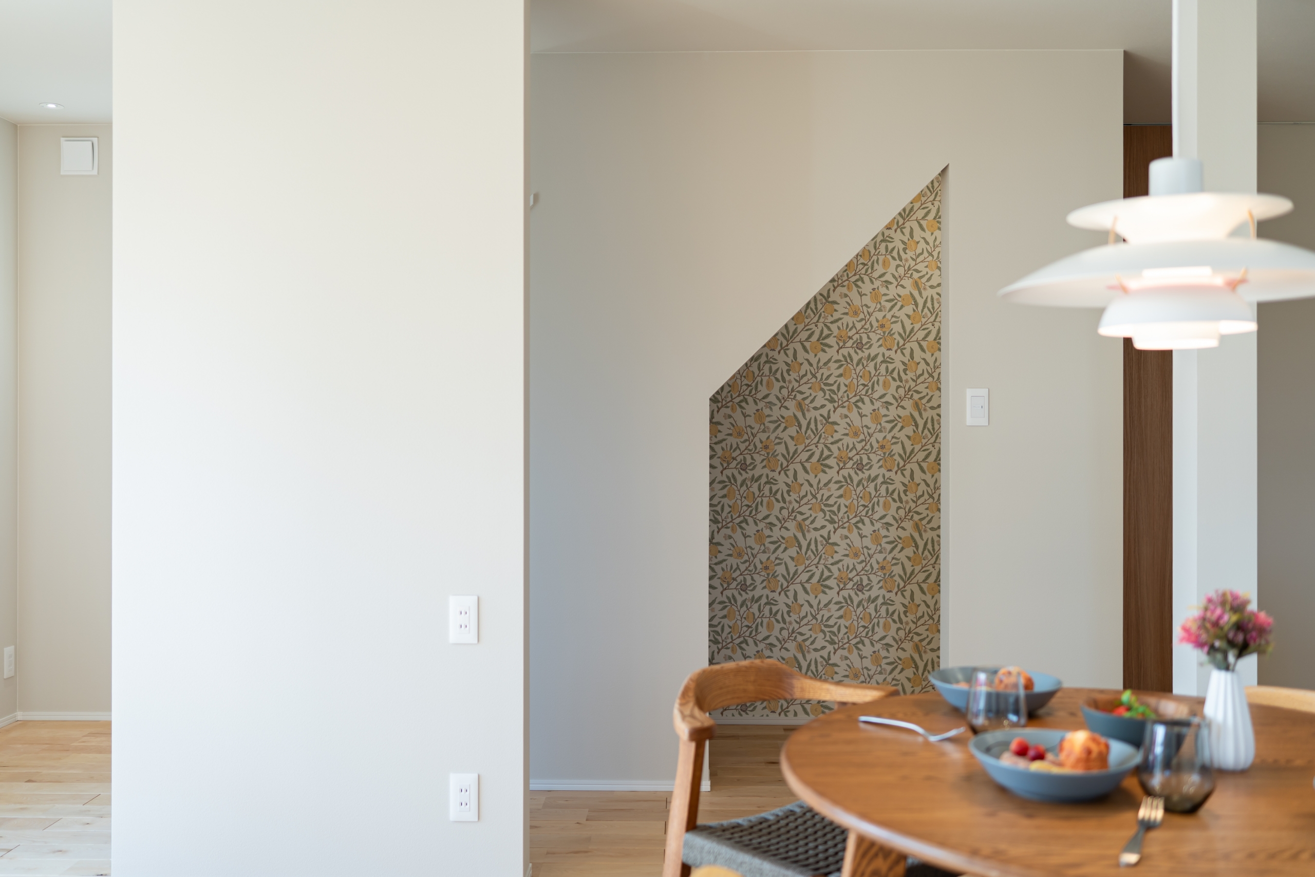 家族が必ずリビングを通る間取りにすることで、日常の中で自然と会話が生まれ、家族のつながりが深まります。 コンパクトな敷地でも空間を広く使える設計により、リビングは開放感があり、のびやかな暮らしを実現。 階段下には、ちょっとした特別な場所“ヌック” を設けました。 お子さまの遊び場として、趣味のスペースとして、時にはワークスペースとして。 さらに樋渡建設の家は、高い 断熱性・耐震性 に加え、制振システムを標準装備。 地震にも強く、快適で省エネな住まいで、家族が安心して長く暮らせる家です。