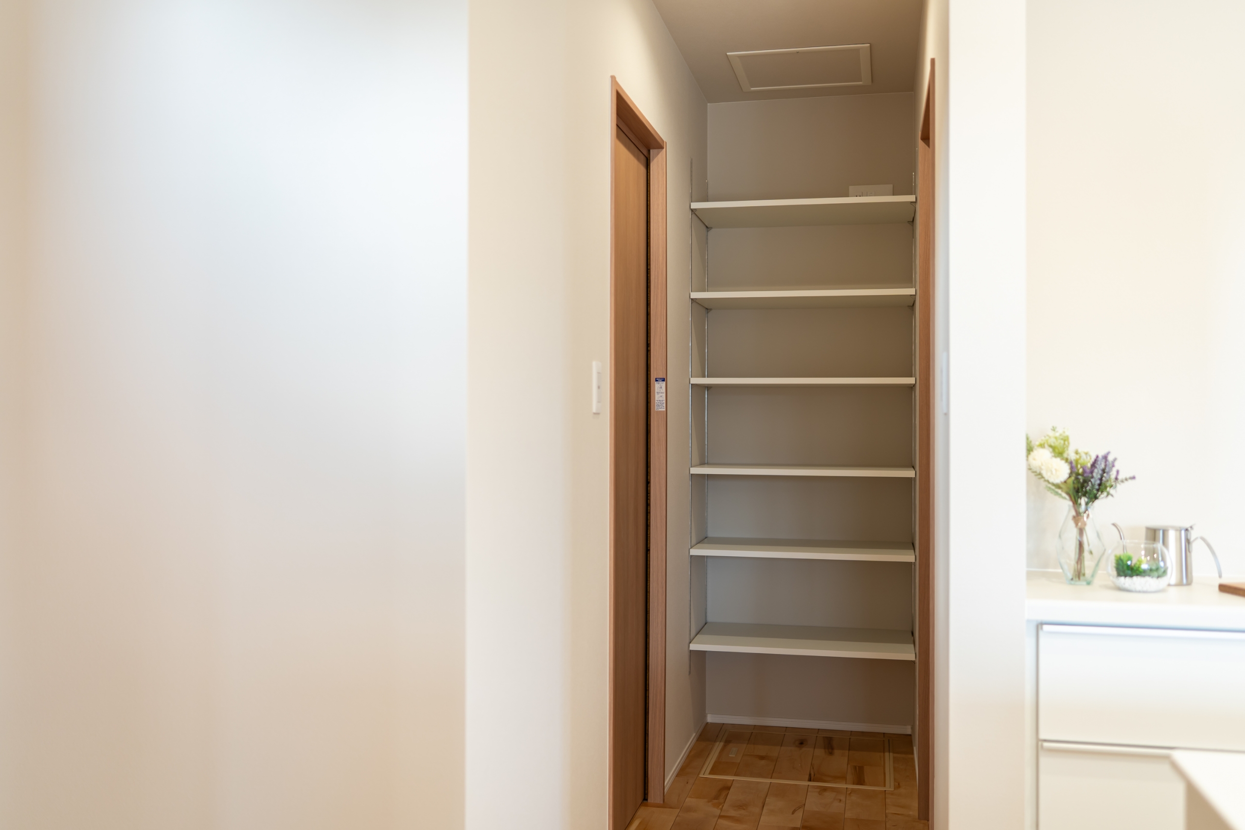 キッチン横に設けたパントリー。食品や日用品をすっきり収納できます。