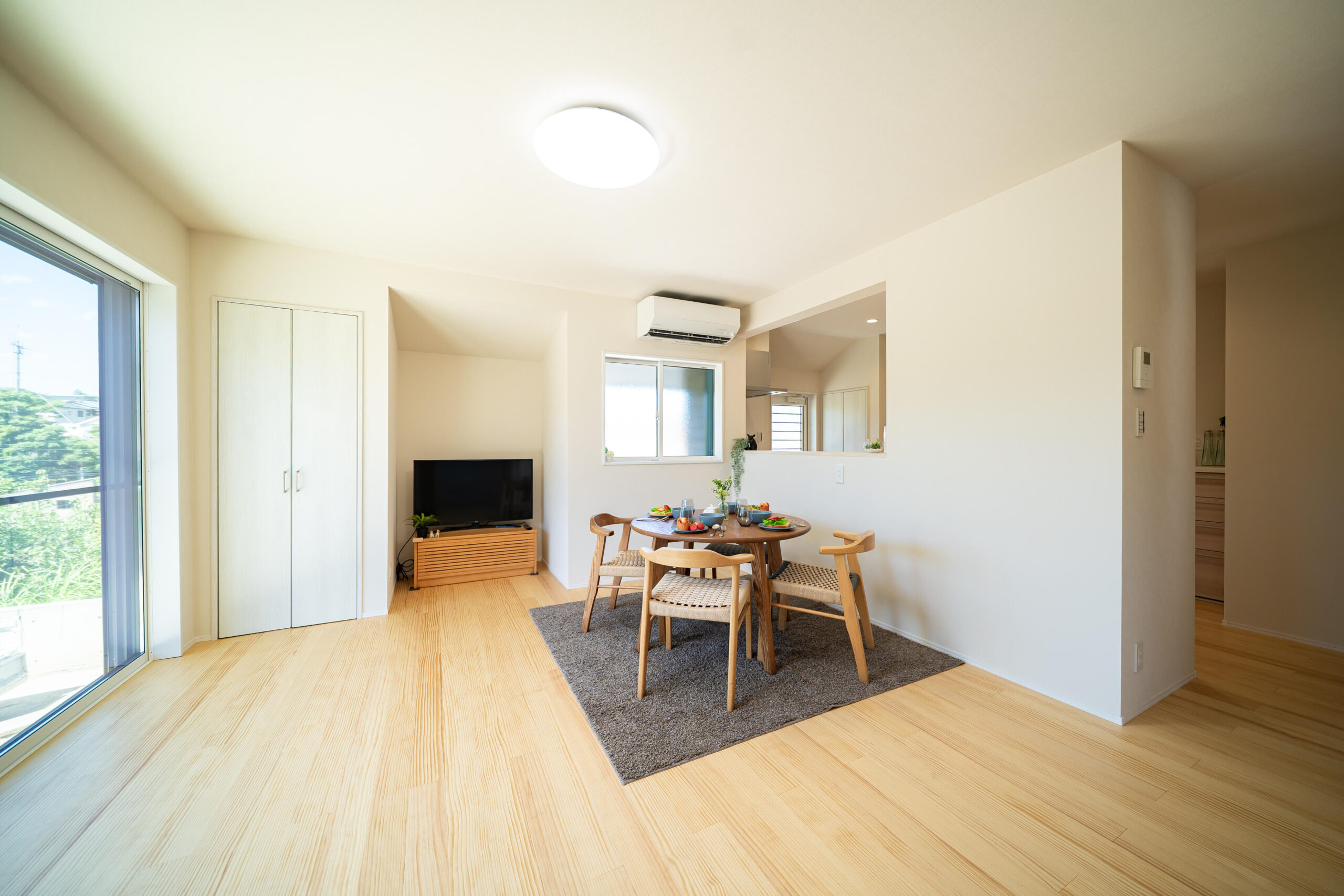 - 空間を利用して天井を高くし、どこにいても家族の顔が見えやすい清潔感のある空間に仕上げました。