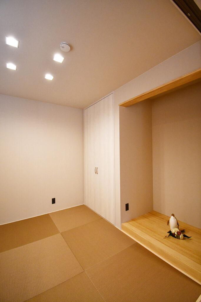 リビング横の和室。赤ちゃんのおむつの交換をするときや、ハイハイをするときにも活躍します。また、キッチンからも畳で遊ぶ子供を見守れるので安心です。ちょっと休憩で寝転びたいときにも便利。子供が大きくなって自分の部屋が欲しくなったり、お家時間が増えて自分のワークスペースが欲しいパパ、たまには「一人の時間が欲しい」ママも。ほどよい距離感が家族のコミュニケーションを育み、同時にプライバシーも保ちます。洗面と脱衣室を分けてあるので、誰かがお風呂に入ってると歯磨きができない!なんてこともないです。また、急なお客さんのときに家族以外の目に触れたくない洗濯物などを脱衣所にしまっておくこともできます。収納スペースもそれぞれの場所に別れるため、収まりやすく使い勝手がよくなります。