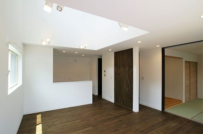 旧 B-Type 02 樋渡建設からの提案 B-Typeをベースに屋根を切妻にした住宅です。室内は白い壁と格子との組み合わせでコントラストが美しく、また、吹き抜けが開放的な空間になっています。水まわりの動線も使い勝手がよく、快適に家事をこなせます。各所に収納があり、機能的な住宅です。
