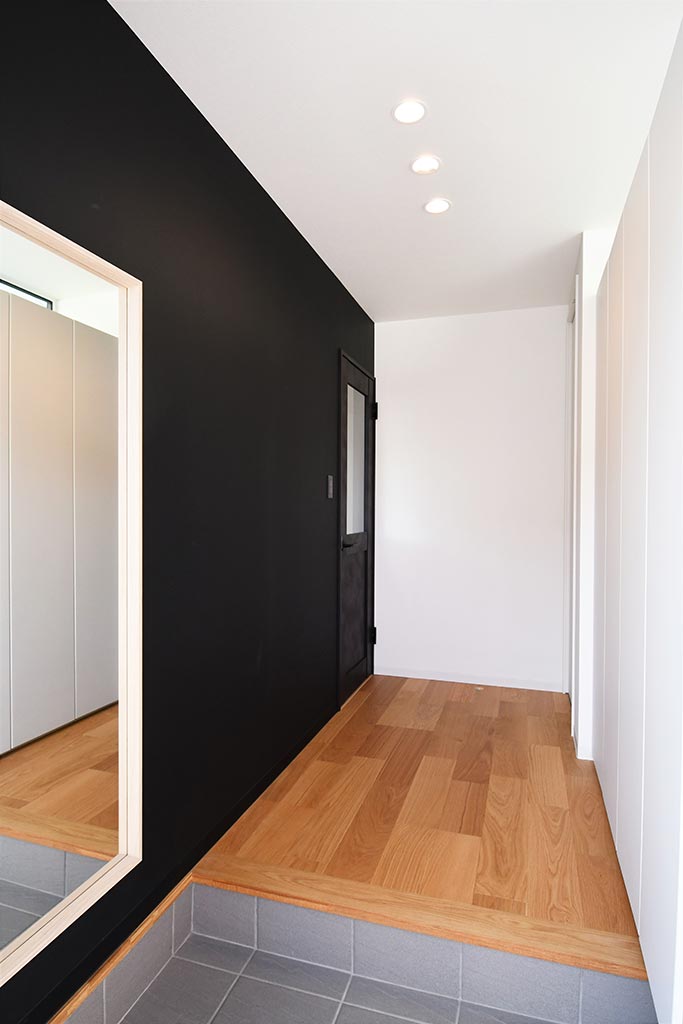 白と黒のコントラストを利かせてすっきりとした外観。内部はお施主様のこだわりが詰ったお家になりました。高性能断熱パネル仕様、HEMS、トリプルガラスの高断熱サッシ、太陽光パネル、制震装置で性能の高い、快適なお家です。長期優良住宅、省令準耐火の建物です。