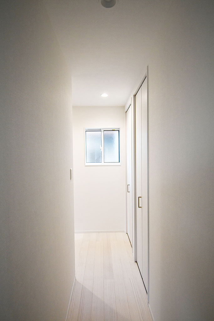 狭小地に建つコンパクトなお家。快適に空間をできるだけ広く使えるように随所に収納を設け、家事空間は十分な広さを確保しました。南側に3階建てての建物が隣接、東側には古いアパートが隣接した敷地のため、LDKの採光は敢えて北側に設けた掃き出し窓と西側の吹抜から採り、室内が暗くならないよう配慮。洗濯物干しにも困らないように外にはバルコニーを、内には洗面脱衣室と2階階段ホールに物干しポールを設置。高性能なうえに工夫がたくさん詰まったお家です。
