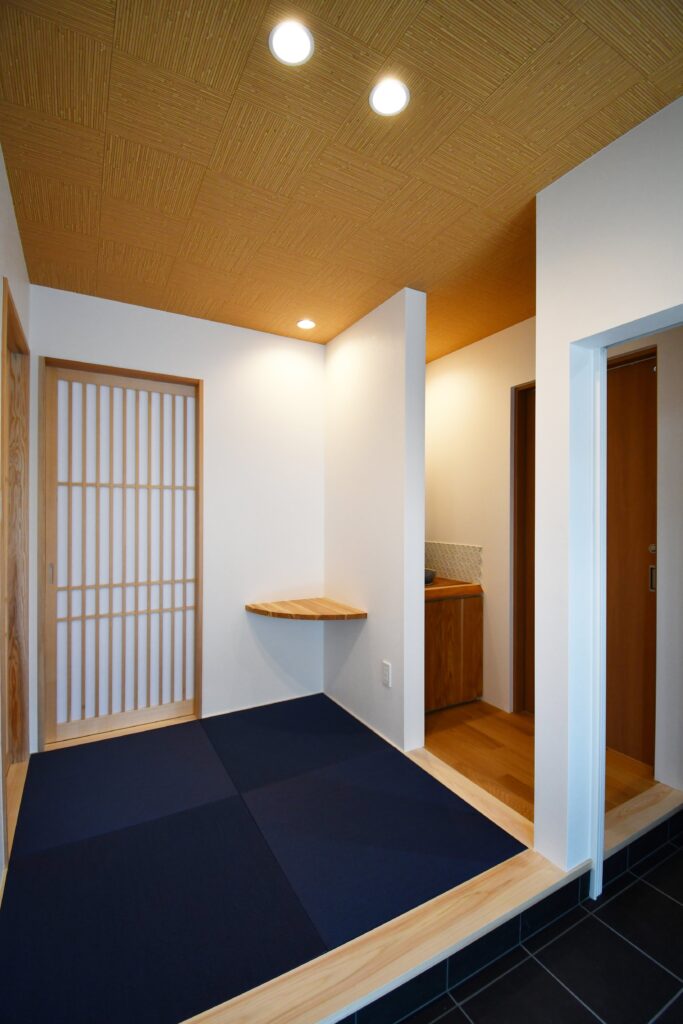 階段横の棚や収納もたっぷりと、吹き抜けからは光が入って明るいリビングになりました。玄関を入ると障子やブルーの畳、手洗いなど、和の粋な雰囲気を出しています。かっこいい和室があったり、キッチンには機能的なカウンターがあったり、収納も充実しています。2Fのフリースペースも楽しく使えそうです。和と木のぬくもりを感じられる家です。高性能断熱パネル仕様、HEMS、トリプルガラスの高断熱サッシ、太陽光発電、制震装置で性能の高い快適なお家です。長期優良住宅になります。