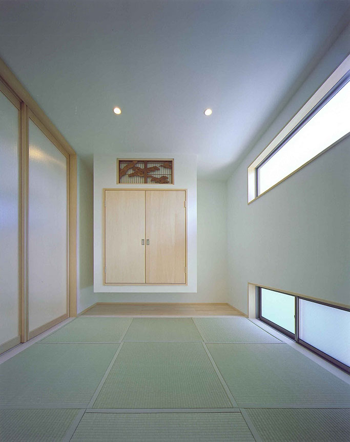 ガレージのある家 樋渡建設からの提案 バイクが趣味の御主人の希望でバイクスペースを設け休日は存分に楽しんでもらえる様に設計した。内部は、リビングを中心に吹抜けを設け1F、2F共につながりをもったプランニングとし建替え時に旧家の欄間、柱を利用して思い出を残し思いのこもった家とした。撮影:石井 紀久