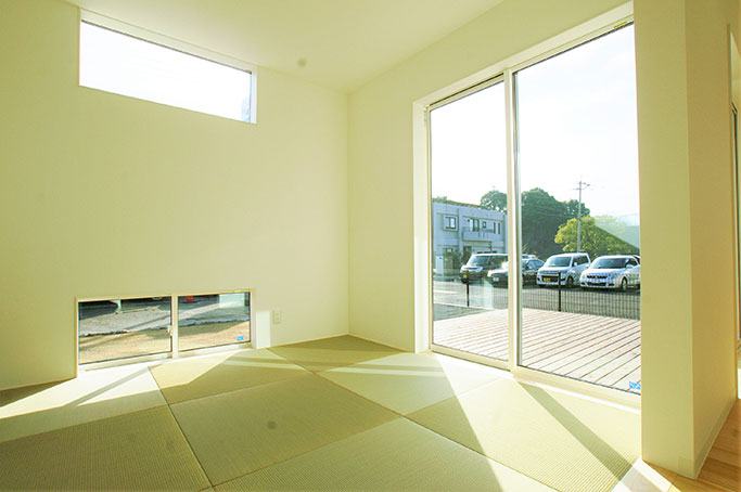 新天の家01 樋渡建設からの提案 リビングを中心とした開放的なお家です。匂いや湿気のこもりやすいキッチン収納やランドリールームなどの壁にはエコカラットを貼りいつもキレイな空気環境で快適に。リビングには座って作業できるスペースがあり本を読んだりパソコン作業をしたり。サービスヤードは色んな用途て使うことができます。